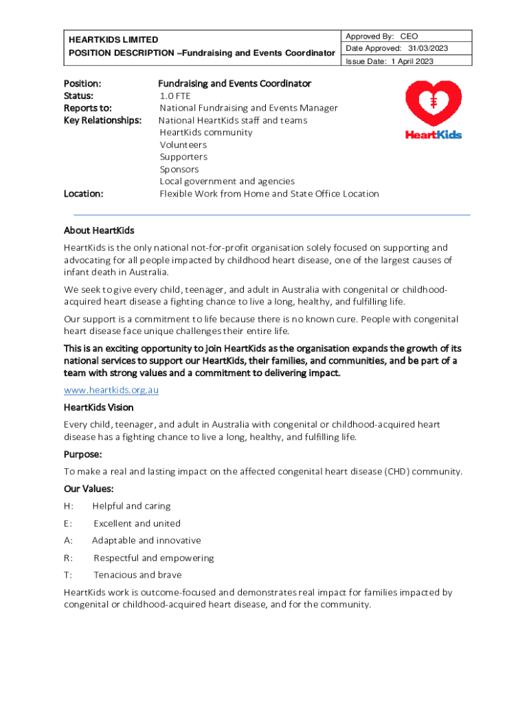 HEARTKIDS LIMITEDApproved By: CEOPOSITION DESCRIPTION Fundraising and Events CoordinatorDate Approved: 31/03/2023 Issue Date: 1 April 2023Position: Status: Reports to: Key Relationships:Location:Fundraising