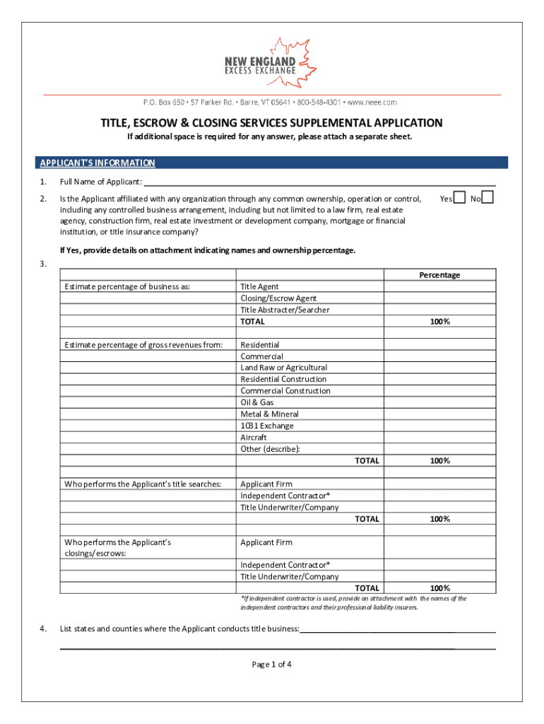 TITLE, ESCROW & CLOSING SERVICES SUPPLEMENTAL APPLICATION If additional space is required for any answer, please attach a separate sheet.APPLICANTS INFORMATION 1.Full Name of Applicant:2.Is the Applicant