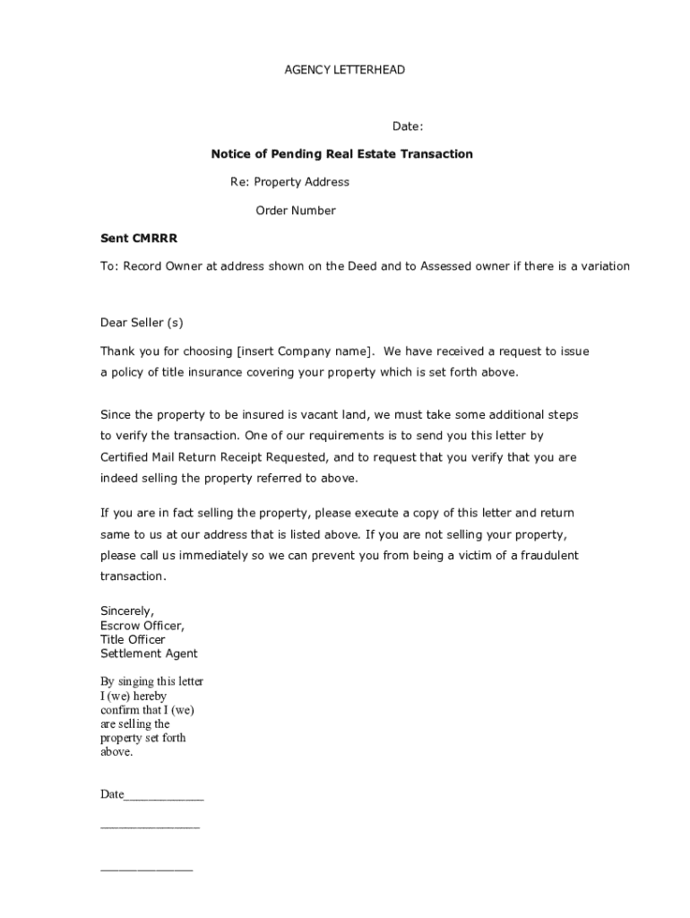 AGENCY LETTERHEADDate: Notice of Pending Real Estate Transaction Re: Property Address Order Number Sent CMRRR To: Record Owner at address shown on the Deed and to Assessed owner if there is a variationDear