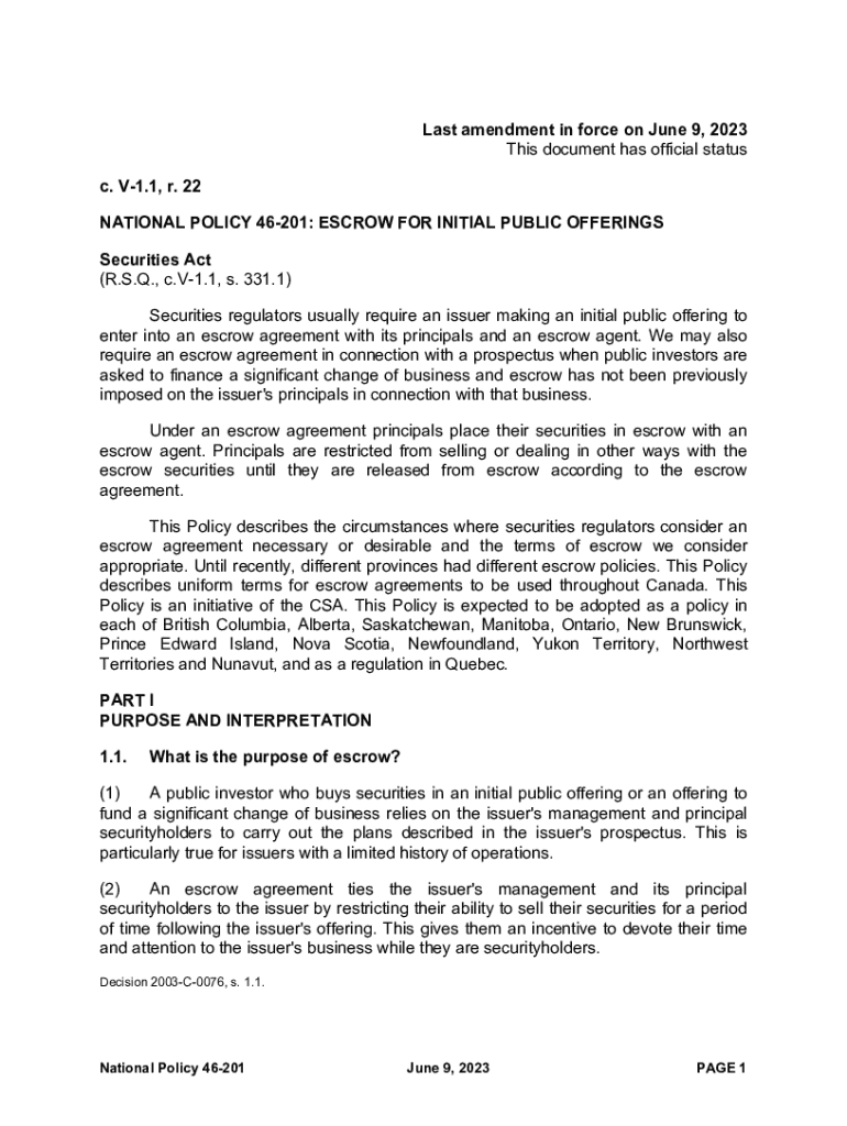 This document outlines the requirements and conditions for escrow agreements related to initial public offerings (IPOs) in Canada. It serves to ensure that issuer\'s management and securityholders remain committed to their obligations by temporarily restricting their ability to sell their securities. The policy describes uniform terms for escrow agreements across different provinces and outlines the circumstances under which escrow is deemed necessary.