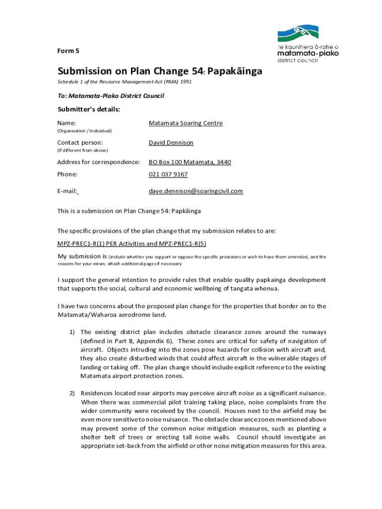 Form 5Submission on Plan Change 54: Papakinga Schedule 1 of the Resource Management Act (RMA) 1991To: MatamataPiako District CouncilSubmitters details: Name:Matamata Soaring Centre(Organisation /