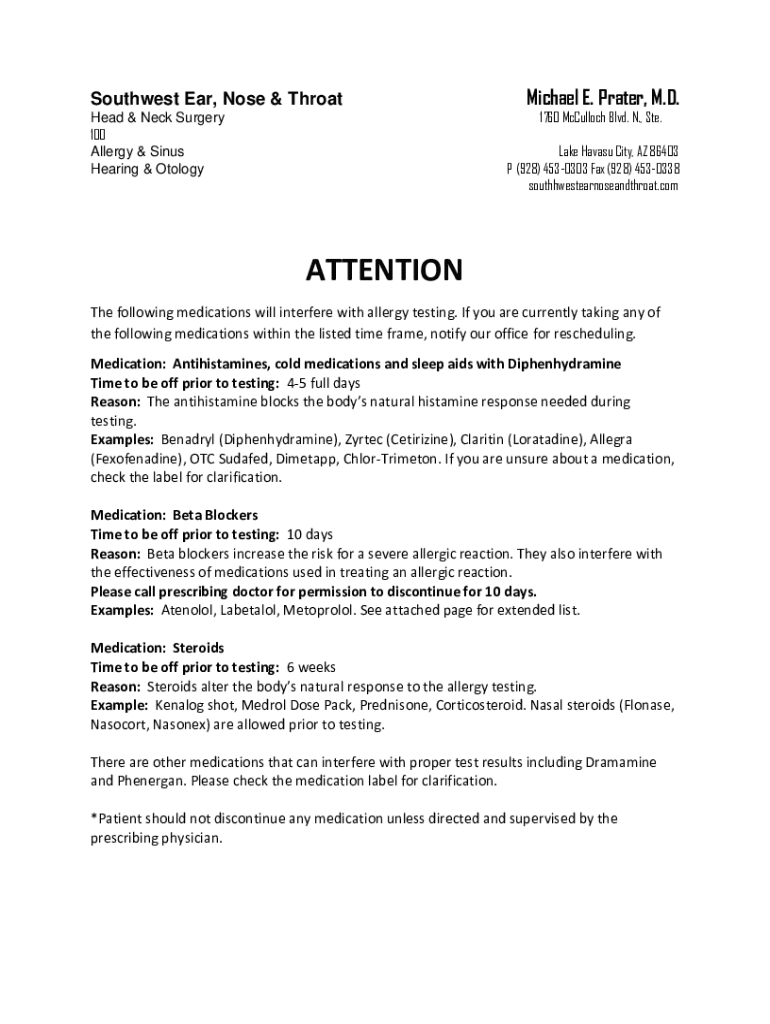 Southwest Ear, Nose & ThroatMichael E. Prater, M.D. 1760 McCulloch Blvd. N., Ste.Head & Neck Surgery 100 Allergy & Sinus Hearing & OtologyLake Havasu City, AZ 86403 P (928) 4530303 Fax (928) 4530338