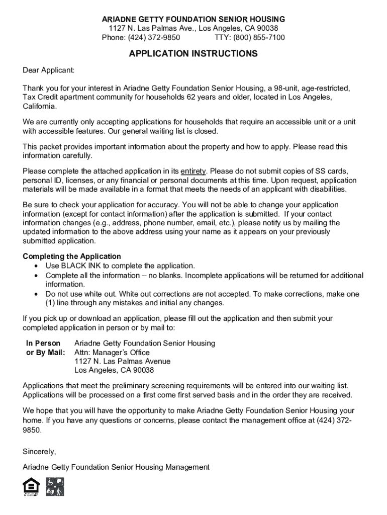 ARIADNE GETTY FOUNDATION SENIOR HOUSING 1127 N. Las Palmas Ave., Los Angeles, CA 90038 Phone: (424) 3729850 TTY: (800) 8557100APPLICATION INSTRUCTIONS Dear Applicant: Thank you for your interest in