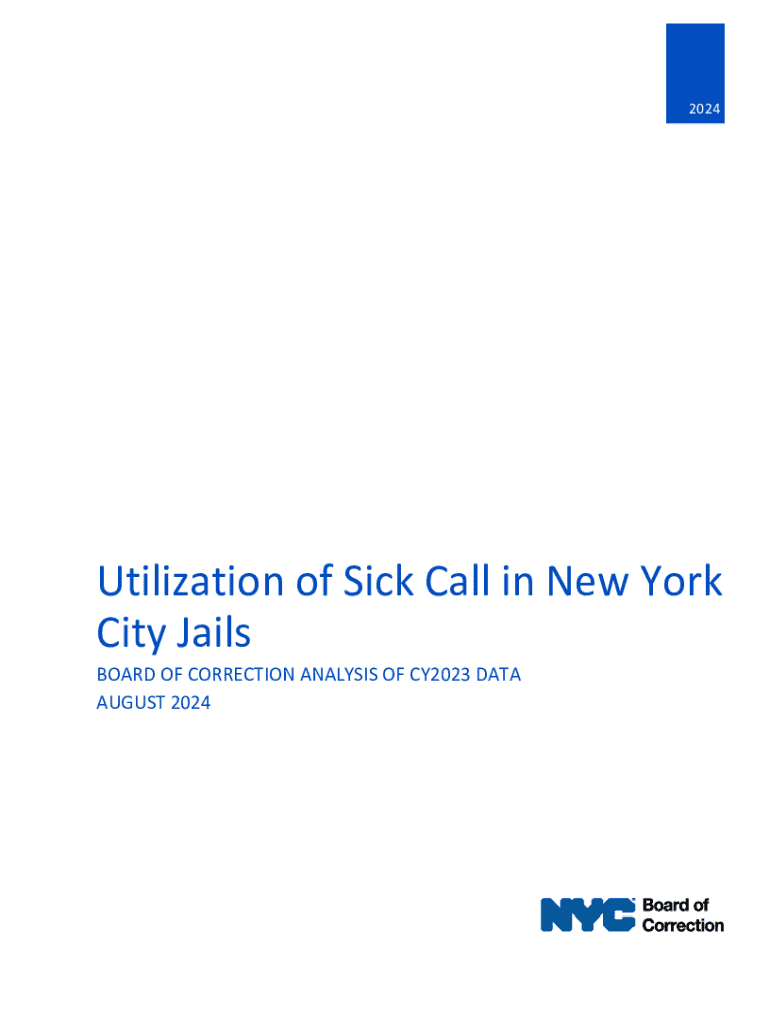 This document details the analysis conducted by the New York City Board of Correction on the provision and timeliness of sick calls in NYC jails for the year 2023. It includes findings, data analysis, recommendations for improving healthcare access for people in custody, and insights into the challenges faced in the sick call process.