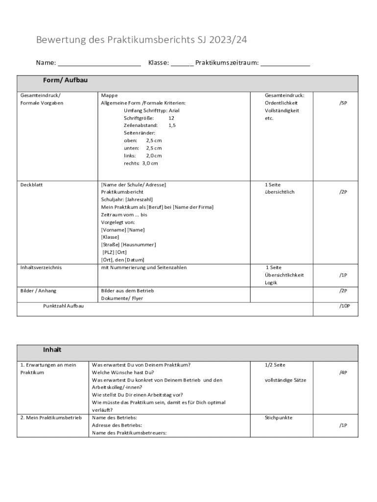 Bewertung des Praktikumsberichts SJ 2023/24 Name: ___ Klasse: ___ Praktikumszeitraum: ___ Form/ Aufbau Gesamteindruck/ Formale VorgabenMappe Allgemeine Form /Formale Kriterien: Umfang Schrifttyp: