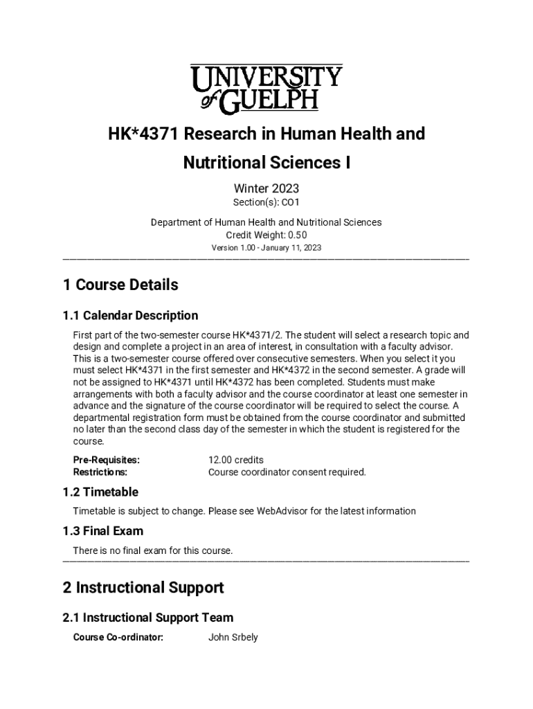 HK*4371 Research in Human Health and Nutritional Sciences I Winter 2023 Section(s): CO1 Department of Human Health and Nutritional Sciences Credit Weight: 0.50 Version 1.00 January 11, 2023 ___1 Course