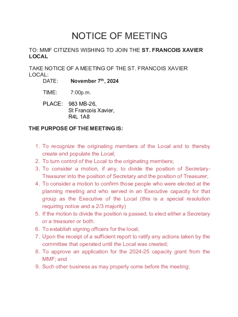 A notice detailing the upcoming meeting of the St. Francois Xavier Local for MMF citizens, outlining the agenda including member recognition, position elections, and grant applications, along with participation guidelines.