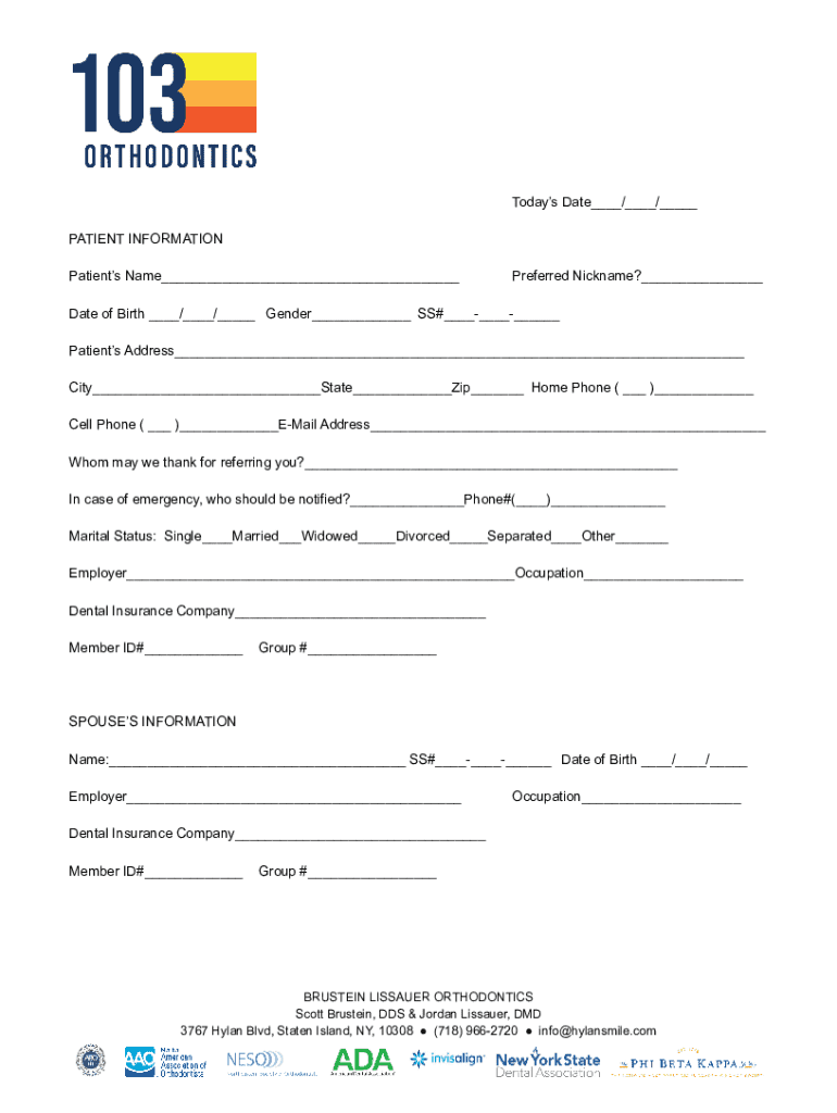 Todays Date___/___/___ PATIENT INFORMATION Patients Name___Preferred Nickname?___Date of Birth ___/___/___ Gender___ SS#_________ Patients Address___ City___State___Zip___ Home Phone ( ___ )___ Cell