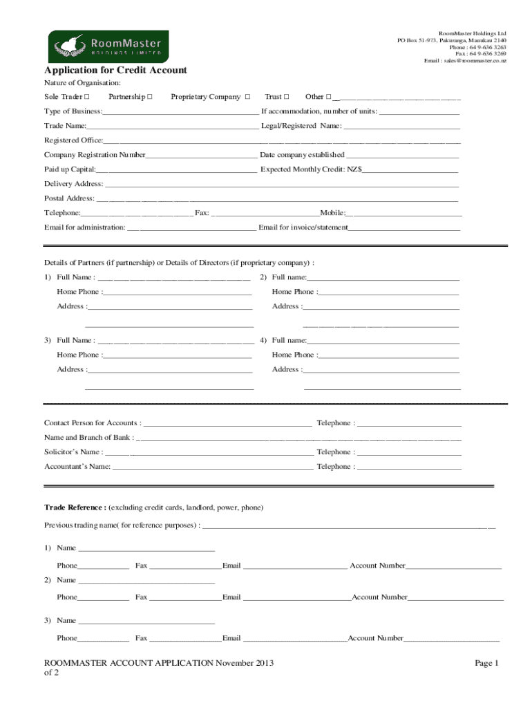 RoomMaster Holdings Ltd PO Box 51973, Pakuranga, Manukau 2140 Phone : 64 9636 3263 Fax : 64 9636 3269 Email : sales@roommaster.co.nzApplication for Credit Account Nature of Organisation: Sole Trader