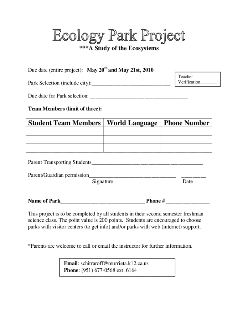 This document outlines a project for freshman students in a science class focused on studying ecosystems through field research at selected parks. Students are tasked with gathering data on park statistics, human impacts, and ecological features, and present their findings in various formats, such as brochures and presentations. The project emphasizes teamwork, research skills, and community service.