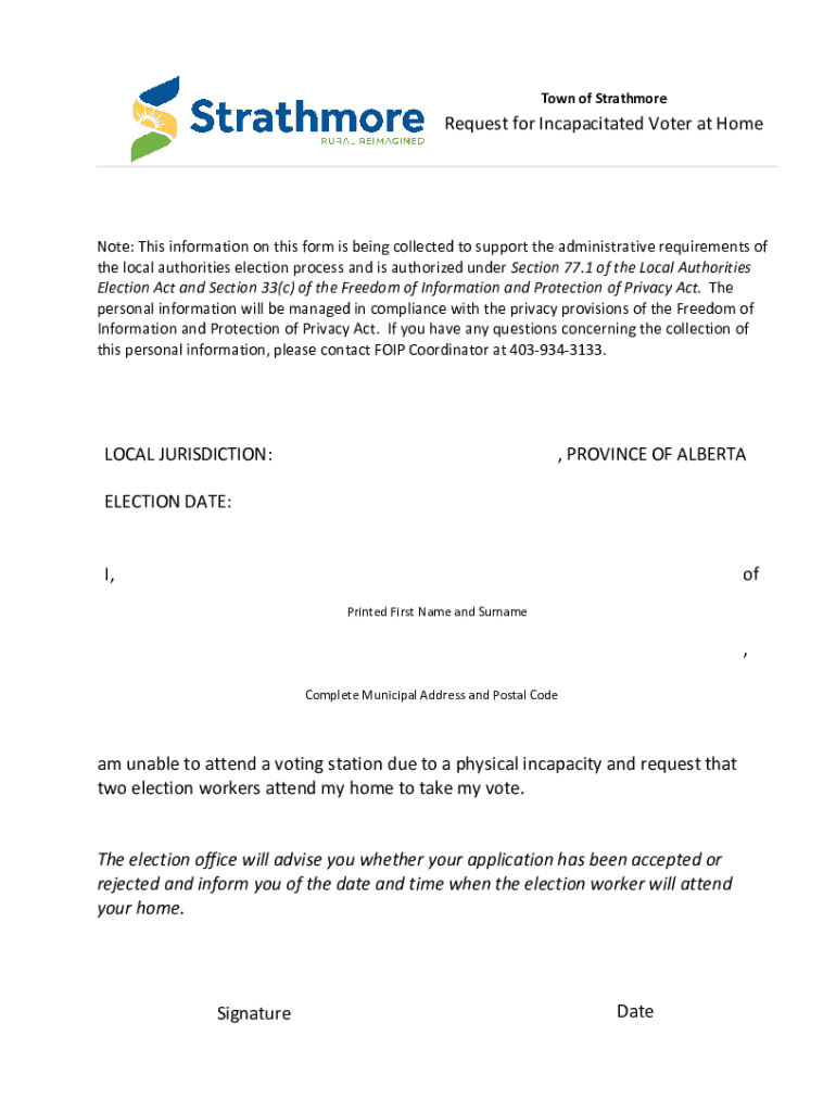 Town of StrathmoreRequest for Incapacitated Voter at HomeNote: This information on this form is being collected to support the administrative requirements of the local authorities election process