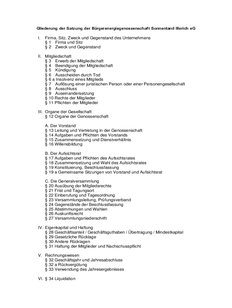 Gliederung der Satzung der Brgerenergiegenossenschaft Sonnenland Illerich eG I.Firma, Sitz, Zweck und Gegenstand des Unternehmens 1 Firma und Sitz 2 Zweck und GegenstandII. Mitgliedschaft 3 Erwerb