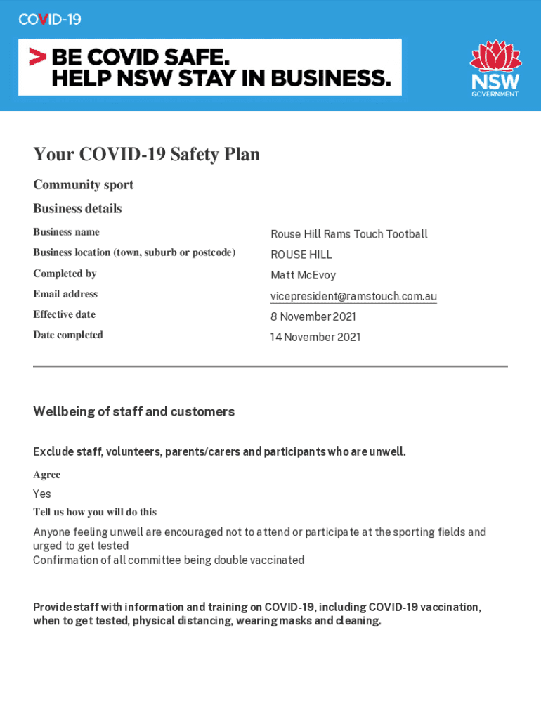 This document outlines the COVID-19 safety measures implemented by the Rouse Hill Rams Touch Football to ensure the wellbeing of staff, volunteers, and participants during community sporting events. It covers areas such as health protocols, physical distancing, ventilation, hygiene, and record-keeping requirements to mitigate the spread of COVID-19.