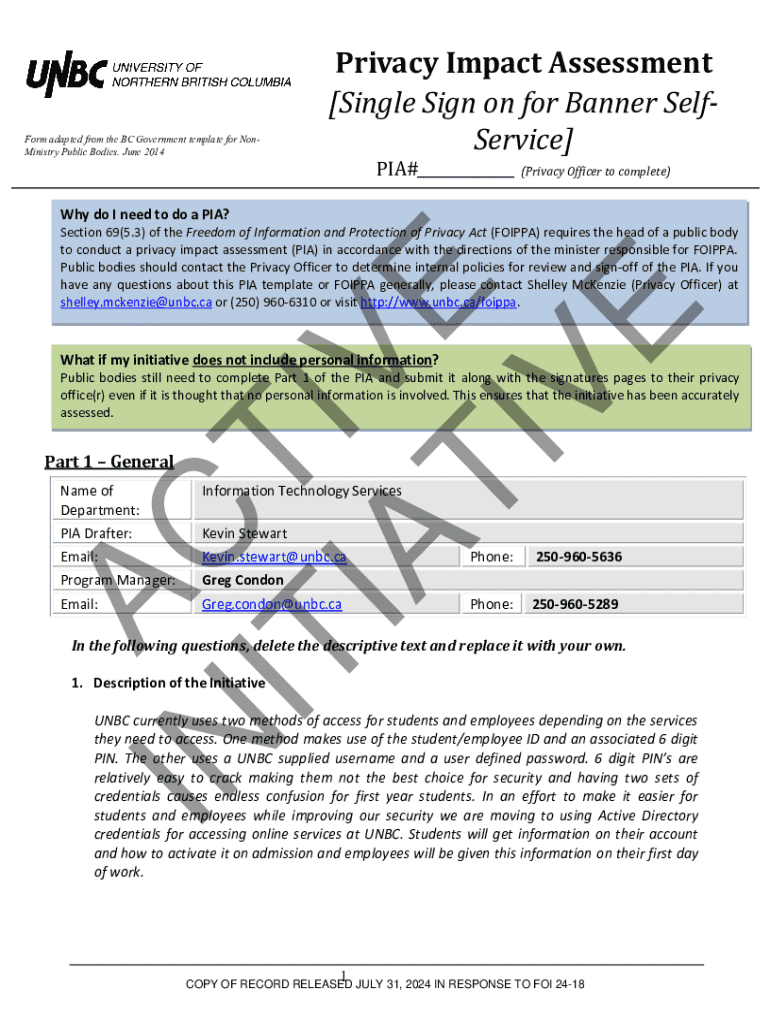 This document outlines the Privacy Impact Assessment (PIA) for the implementation of a Single Sign-On (SSO) system for accessing online services at the University of Northern British Columbia (UNBC). The assessment details the initiative\'s scope, personal information management, data security measures, and the inherent risks associated with the transition from multiple credential systems to a unified SSO approach that aims to enhance both security and user convenience.