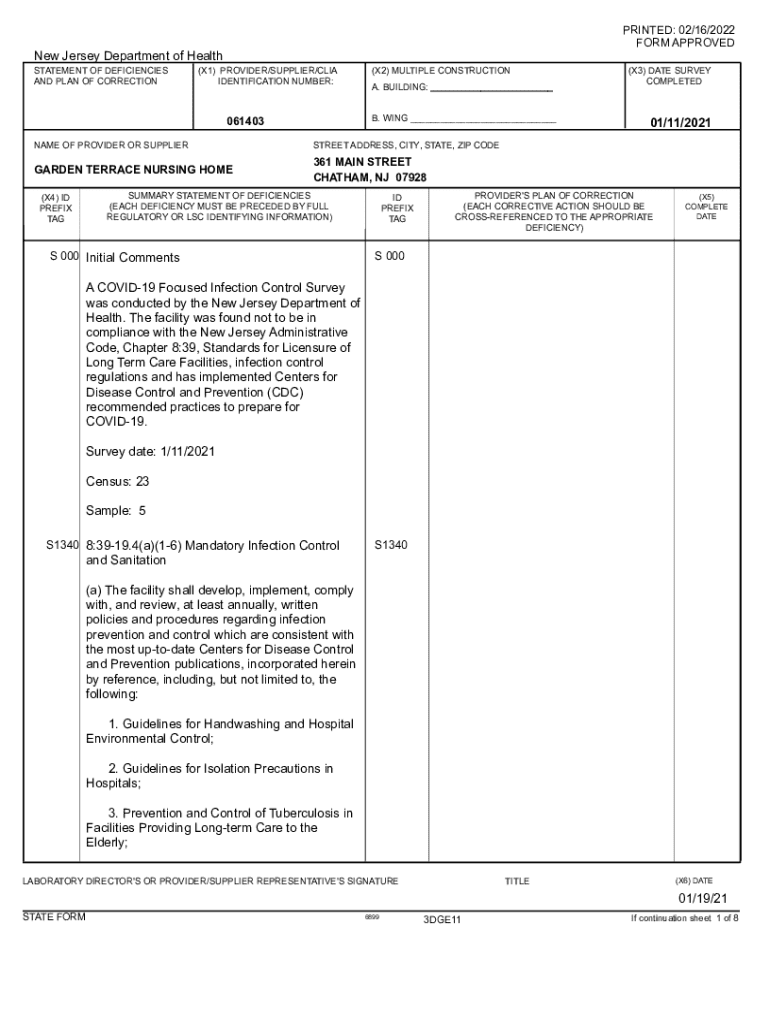 PRINTED: 02/16/2022 FORM APPROVEDNew Jersey Department of Health STATEMENT OF DEFICIENCIES AND PLAN OF CORRECTION(X1) PROVIDER/SUPPLIER/CLIA IDENTIFICATION NUMBER:(X2) MULTIPLE CONSTRUCTION A. BUILDING:
