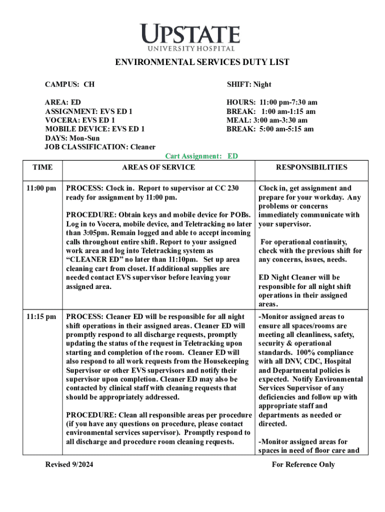 ENVIRONMENTAL SERVICES DUTY LIST CAMPUS: CHSHIFT: NightAREA: ED ASSIGNMENT: EVS ED 1 VOCERA: EVS ED 1 MOBILE DEVICE: EVS ED 1 DAYS: MonSun JOB CLASSIFICATION: CleanerHOURS: 11:00 pm7:30 am BREAK:
