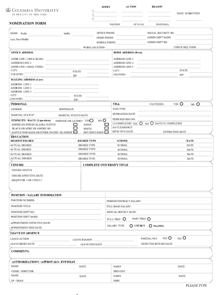 ACTIONEFFDTREASON1.DATE` SUBMITTED2. 3.NOMINATION FORM NAMEOF TOTALPOSITIONSuffixPrefixLast, First MiddlePOSITION(S)OFFICE PHONESOCIAL SECURITY NO.HOME PHONEADMIN DEPT NAMEMOBILE PHONEADMIN DEPT NO.