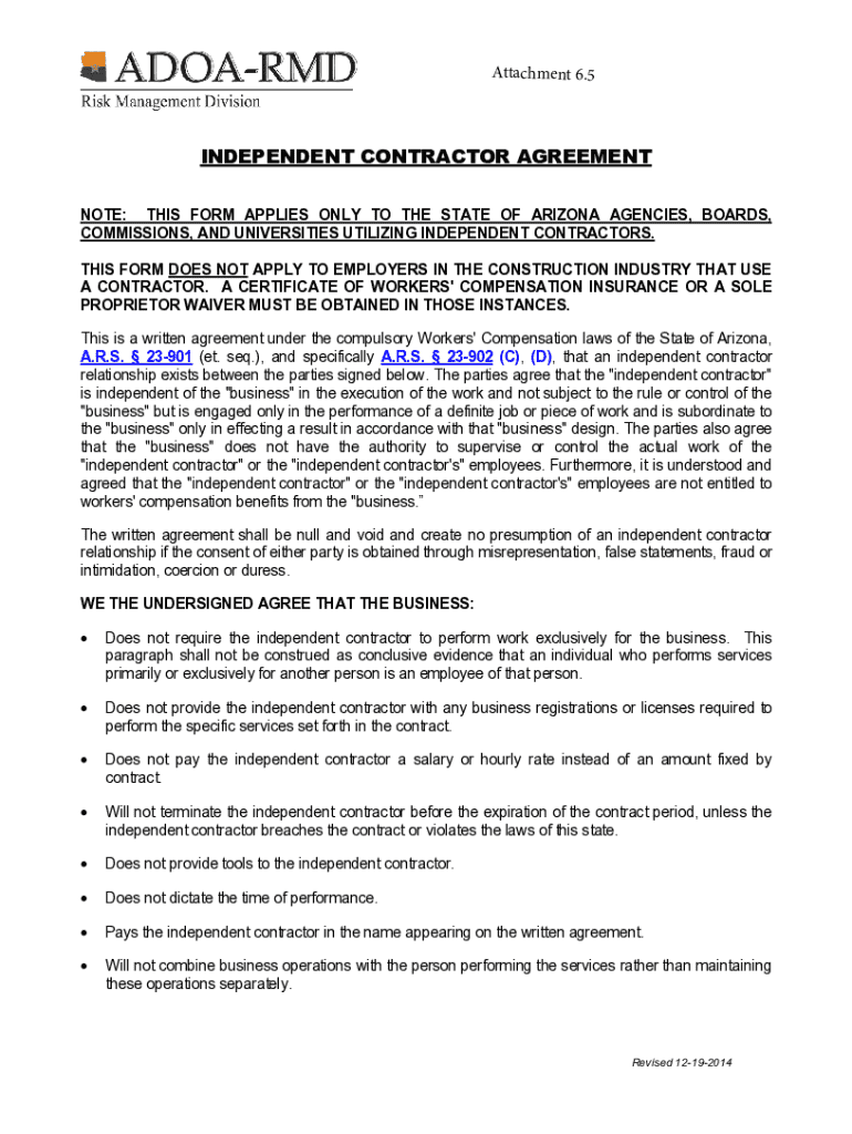 This document outlines the terms and conditions of an independent contractor relationship between a business and an independent contractor in the State of Arizona, detailing the rights, obligations, and limitations inherent in such agreements according to Arizona\'s Workers\' Compensation laws.
