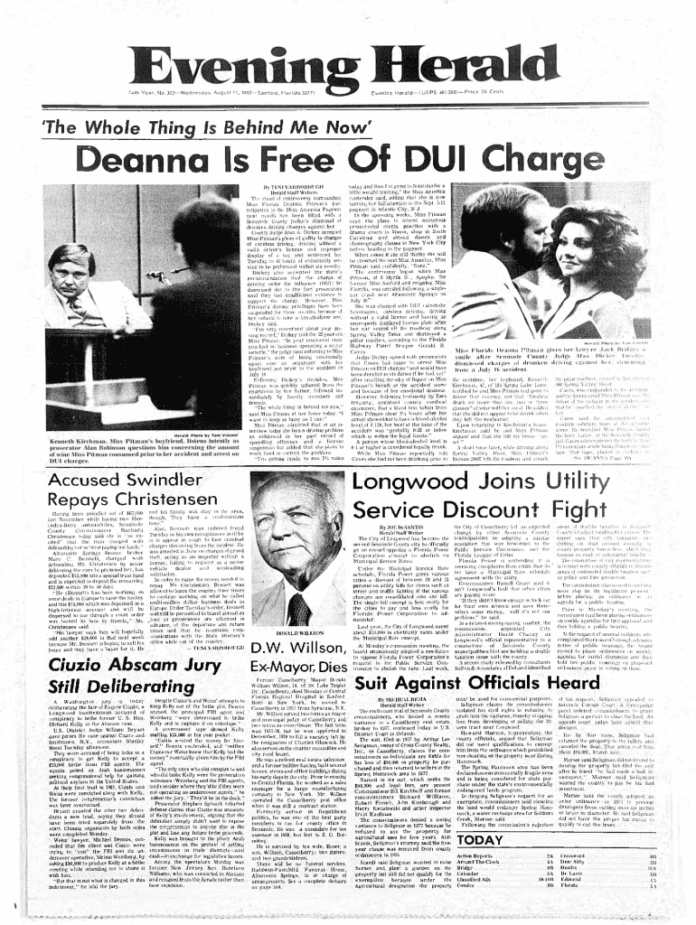 Evening Herald (U S P S 481 2801P rice 20 Cents74th Y e ar, No 303Wednesday, August IT, 1982Sanford, Florida 32771\'The Whole Thing Is Behind M e Now\'Deanna Is Free Of DUI ChargeH c rjld Photo by