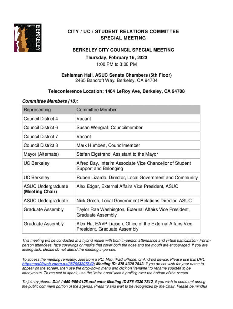 CITY / UC / STUDENT RELATIONS COMMITTEE SPECIAL MEETING BERKELEY CITY COUNCIL SPECIAL MEETING Thursday, February 15, 2023 1:00 PM to 3:00 PM Eshleman Hall, ASUC Senate Chambers (5th Floor) 2465 Bancroft