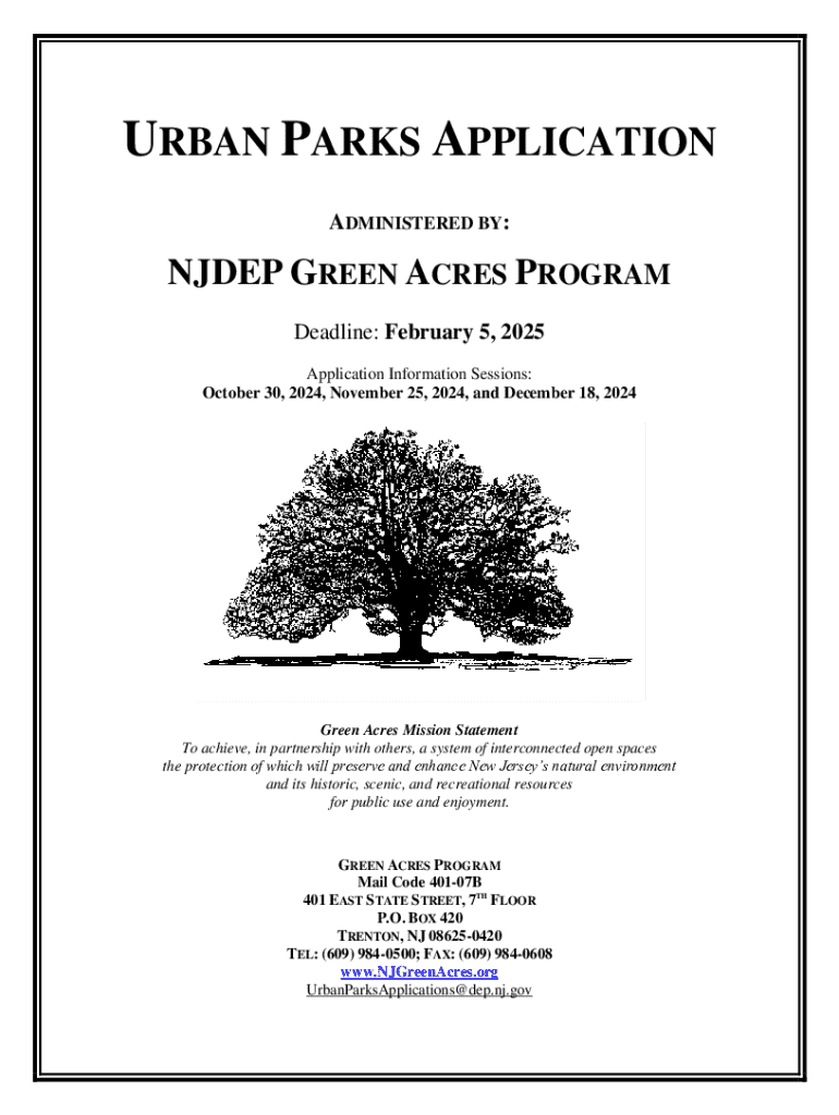 This document provides guidelines and requirements for applicants seeking funding through the Urban Parks initiative, administered by the New Jersey Department of Environmental Protection\'s Green Acres Program. The funding aims to support the creation and enhancement of urban parks in New Jersey, with particular attention to projects located within or easily accessible from overburdened communities. The document details eligibility criteria, funding request limits, project priorities, public...