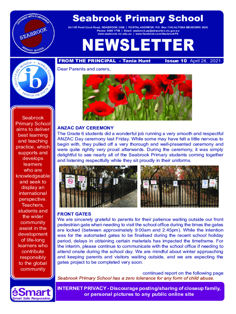 Seabrook Primary School 83105 Point Cook Road, SEABROOK 3028 | POSTAL ADDRESS: P.O. Box 1143 ALTONA MEADOWS 3028 Phone: 9395 1758 | Email: seabrook.ps@education.vic.gov.au www.seabrook.vic.edu.au