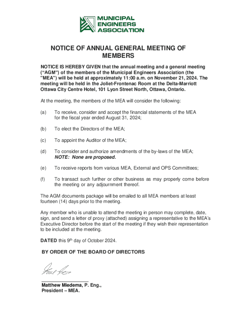 NOTICE OF ANNUAL GENERAL MEETING OF MEMBERS NOTICE IS HEREBY GIVEN that the annual meeting and a general meeting (AGM) of the members of the Municipal Engineers Association (the \"MEA\") will be held