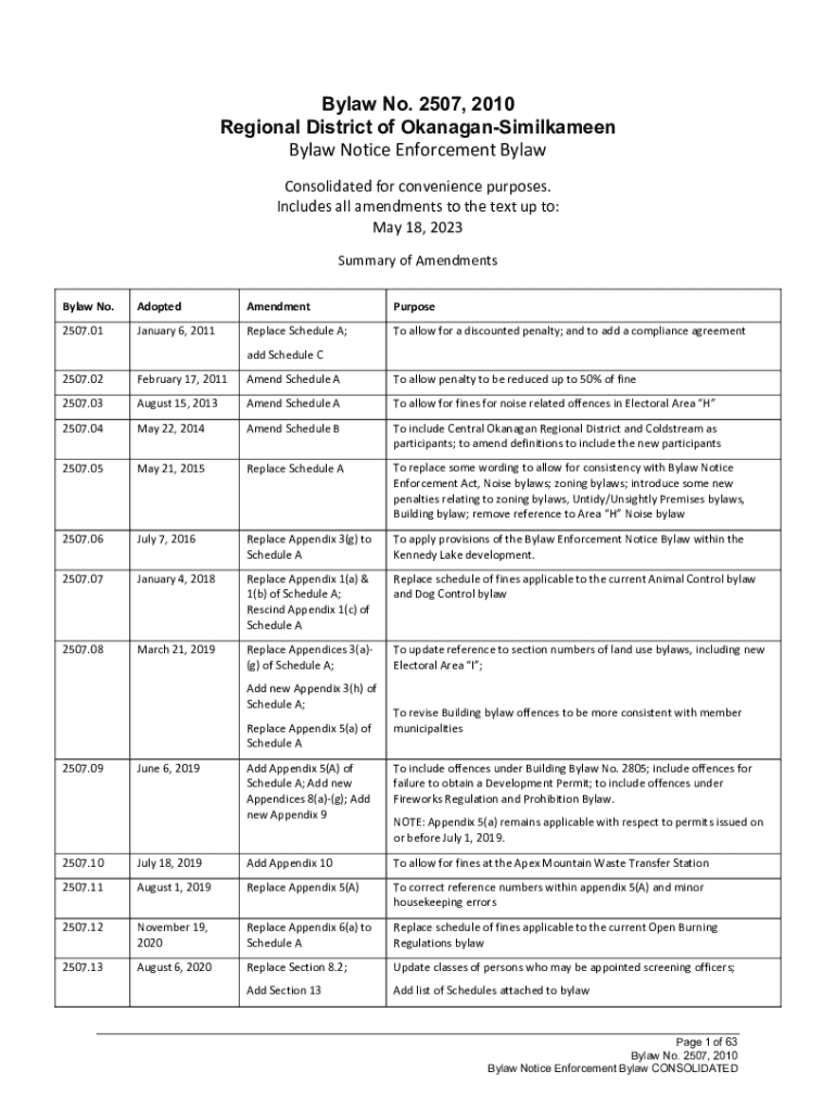 Bylaw No. 2507, 2010 Regional District of OkanaganSimilkameen Bylaw Notice Enforcement Bylaw Consolidated for convenience purposes. Includes all amendments to the text up to: May 18, 2023 Summary