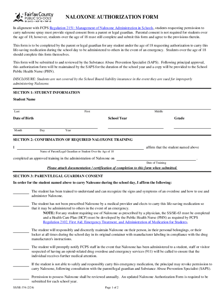 Review any necessary training or information required for naloxone use that may be included with the form.