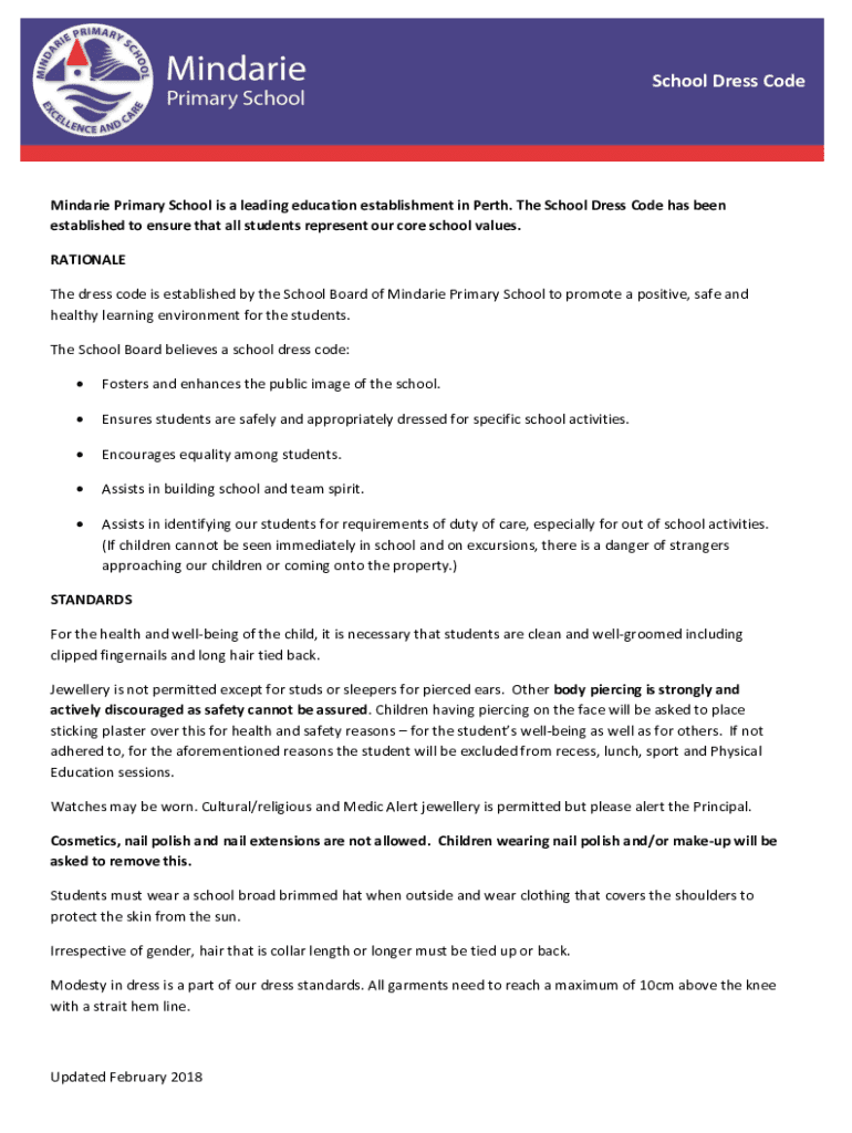 School Dress CodeMindarie Primary School is a leading education establishment in Perth. The School Dress Code has been established to ensure that all students represent our core school values. RATIONALE