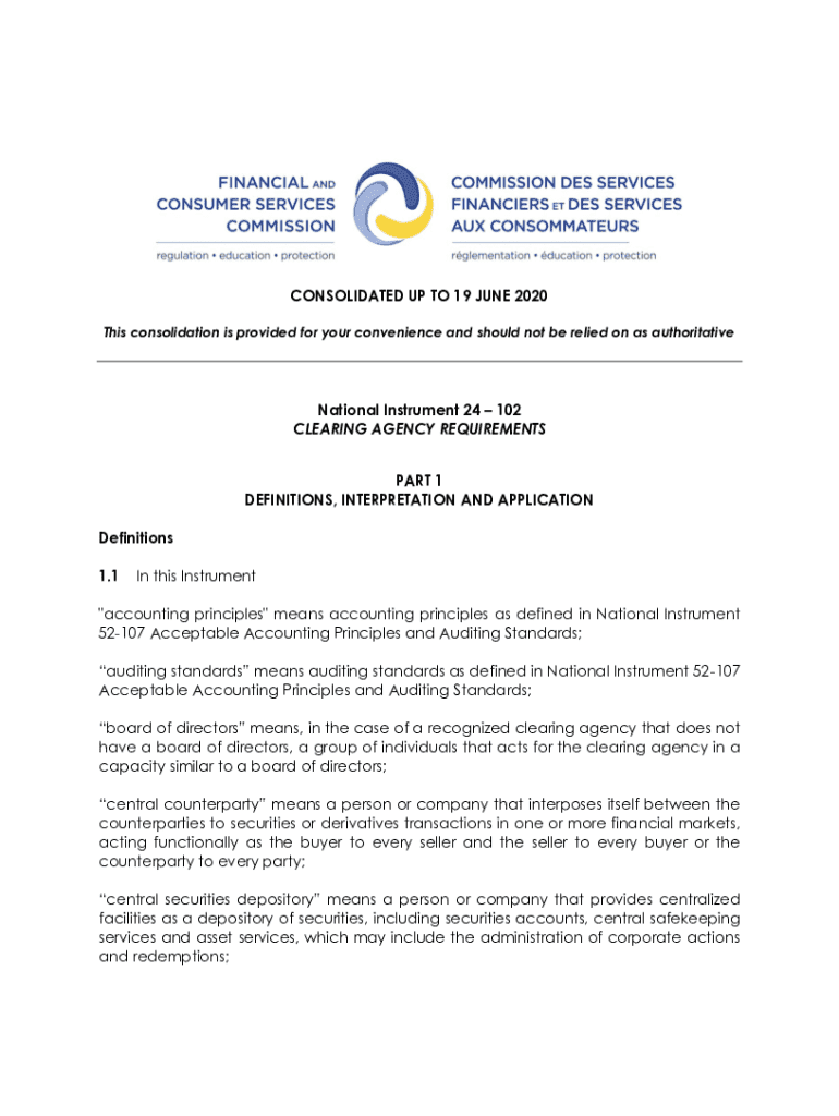 CONSOLIDATED UP TO 19 JUNE 2020 This consolidation is provided for your convenience and should not be relied on as authoritativeNational Instrument 24 102 CLEARING AGENCY REQUIREMENTS PART 1 DEFINITIONS,