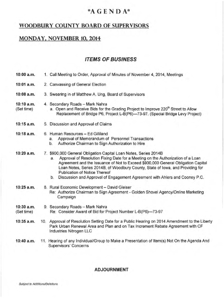 *AGENDA* WOODBURY COUNTY BOARD OF SUPERVISORS MONDAY, NOVEMBER 10, 2014ITEMS OF BUSINESS 10:00 a.m.1. Call Meeting to Order, Approval of Minutes of November 4, 2014, Meetings10:01 a.m.2. Canvassing