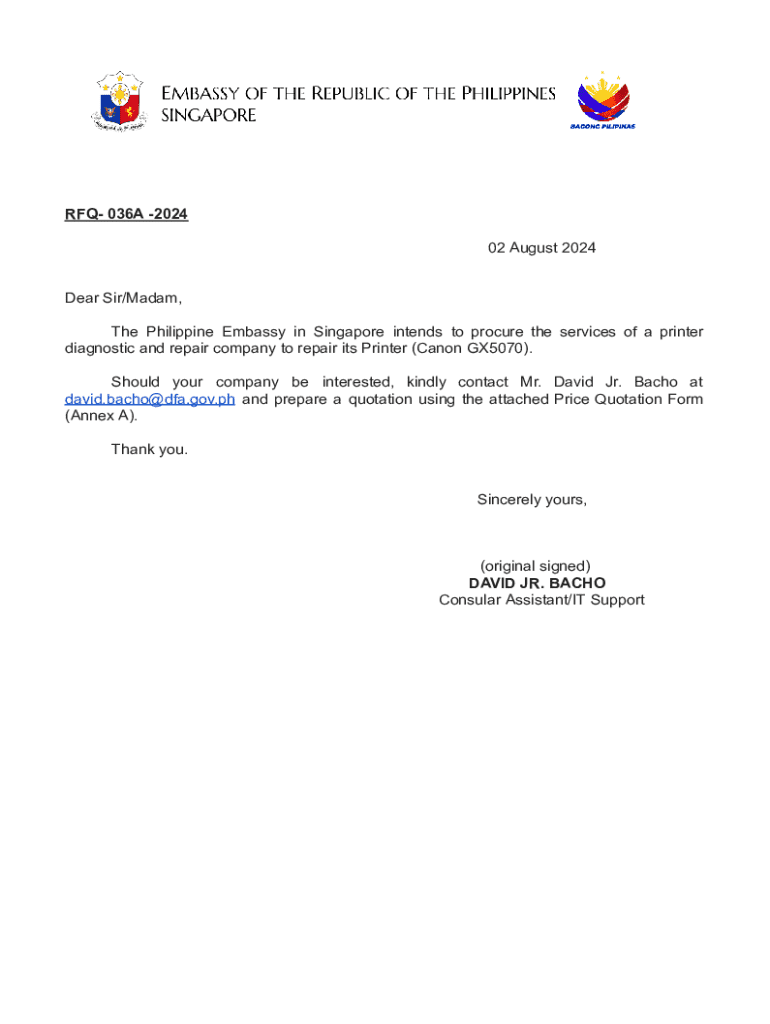 RFQ 036A 2024 02 August 2024 Dear Sir/Madam, The Philippine Embassy in Singapore intends to procure the services of a printer diagnostic and repair company to repair its Printer (Canon GX5070). Should