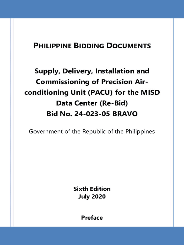 This document outlines the procedures and requirements for bidding on the procurement of a Precision Air-conditioning Unit (PACU) for the MISD Data Center under the Civil Aviation Authority of the Philippines. It includes details on eligibility criteria, bidding processes, technical specifications, and contract obligations as per the Government Procurement Policy Board regulations.