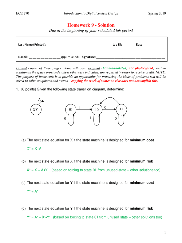 ECE 270Introduction to Digital System DesignSpring 2019Homework 9 Solution Due at the beginning of your scheduled lab period Last Name (Printed): ___ Lab Div: ___Date: ___Email: __ __ __ __ __ __