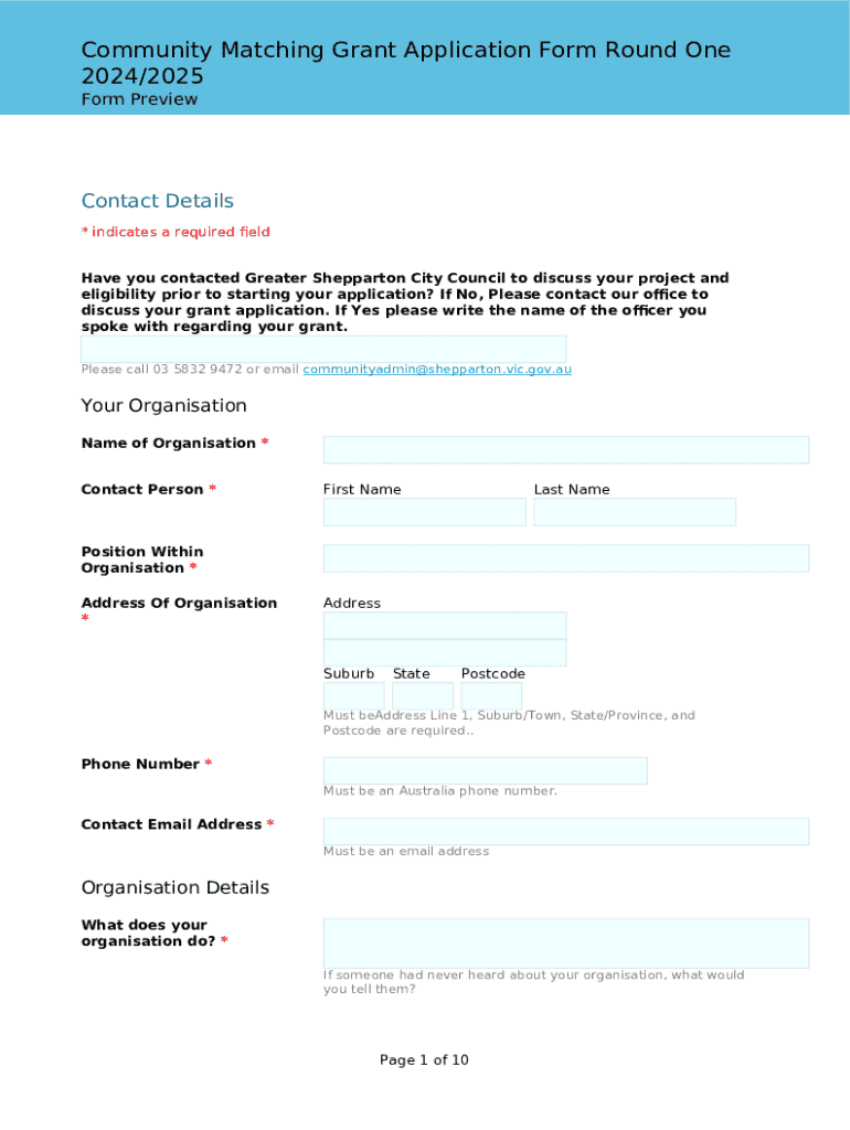 Community Matching Grant Application Form Round One 2024/2025 Form PreviewContact Details * indicates a required eld Have you contacted Greater Shepparton City Council to discuss your project and