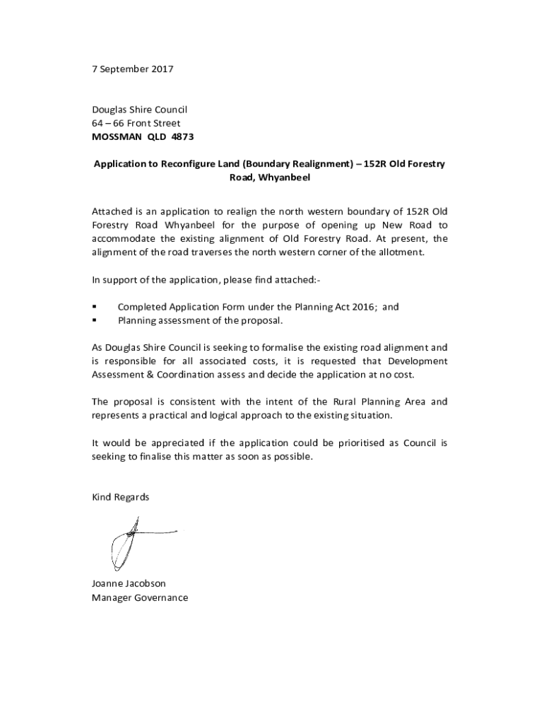 7 September 2017Douglas Shire Council 64 66 Front Street MOSSMAN QLD 4873 Application to Reconfigure Land (Boundary Realignment) 152R Old Forestry Road, Whyanbeel Attached is an application to realign