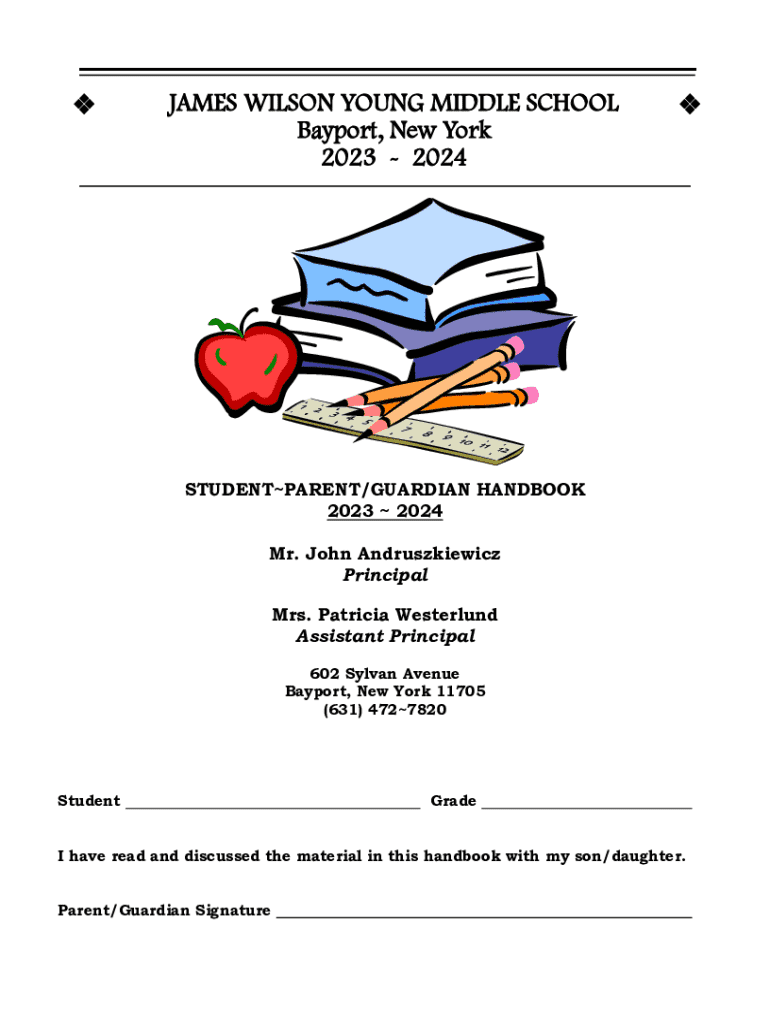 This handbook provides important information for students and parents/guardians regarding policies, expectations, and resources at James Wilson Young Middle School for the academic year 2023 - 2024. It includes guidelines for attendance, behavior, extracurricular activities, and bullying prevention.