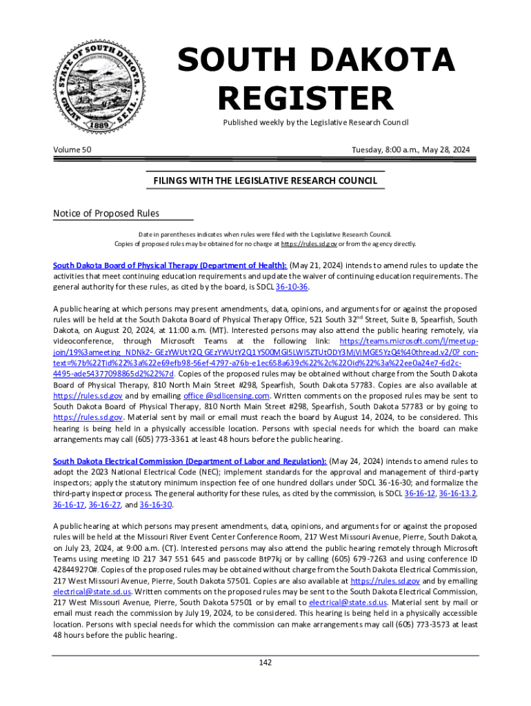 SOUTH DAKOTA REGISTER Published weekly by the Legislative Research Council Volume 50Tuesday, 8:00 a.m., May 28, 2024FILINGS WITH THE LEGISLATIVE RESEARCH COUNCIL Notice of Proposed Rules Date in parentheses