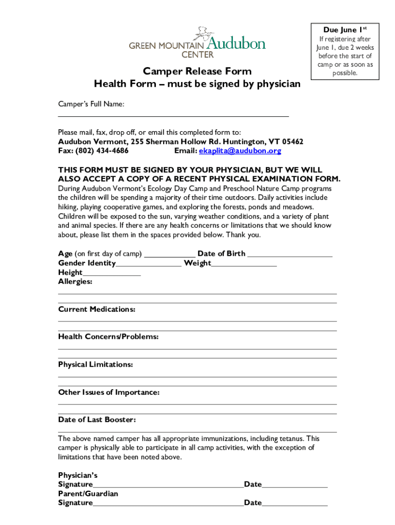 Due June 1stCamper Release Form Health Form must be signed by physicianIf registering after June 1, due 2 weeks before the start of camp or as soon as possible.Campers Full Name: ___ Please mail,
