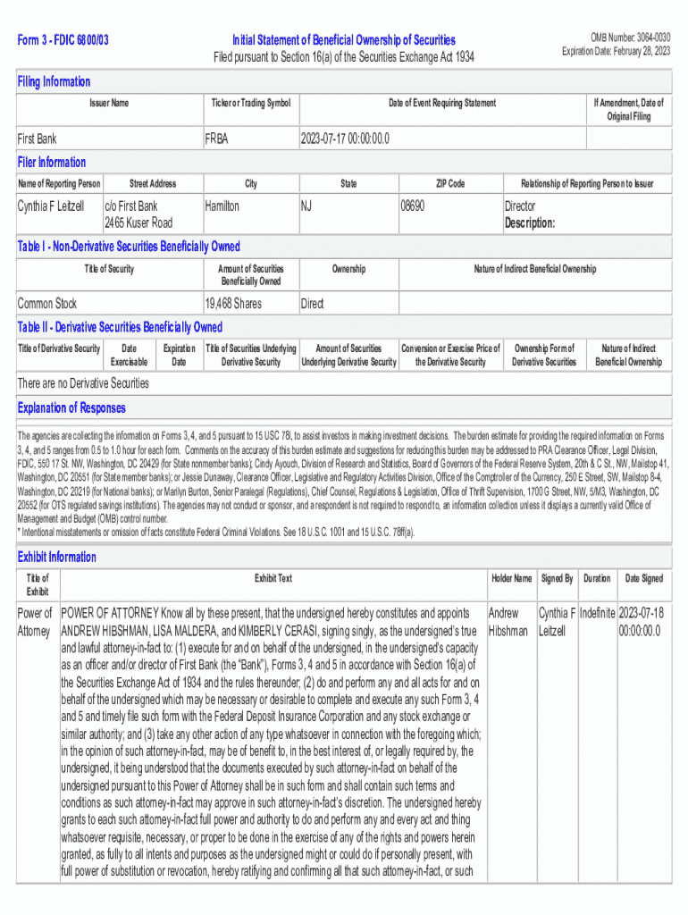 This document is a formal filing required under Section 16(a) of the Securities Exchange Act of 1934, disclosing the beneficial ownership of securities for Cynthia F. Leitzell, a director at First Bank. It includes details about non-derivative securities owned and the power of attorney pertaining to the execution of required forms.