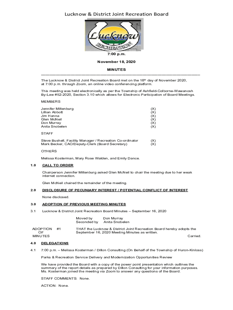 Lucknow & District Joint Recreation Board7:00 p.m. November 18, 2020 MINUTES___ The Lucknow & District Joint Recreation Board met on the 18th day of November 2020, at 7:00 p.m. through Zoom, an online