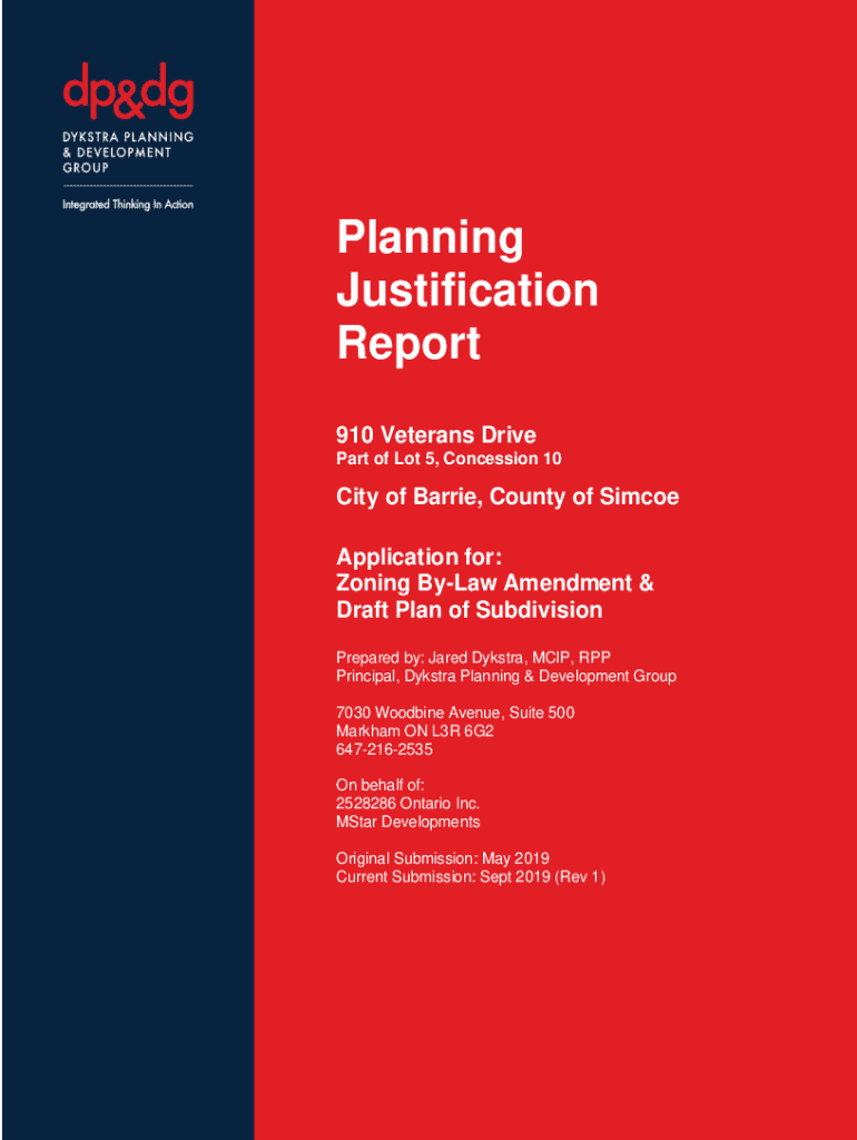 Planning Justification Report 910 Veterans Drive Part of Lot 5, Concession 10City of Barrie, County of Simcoe Application for: Zoning ByLaw Amendment & Draft Plan of Subdivision Prepared by: Jared