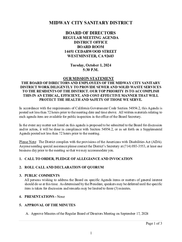 MIDWAY CITY SANITARY DISTRICT BOARD OF DIRECTORSREGULAR MEETING AGENDA DISTRICT OFFICE BOARD ROOM 14451 CEDARWOOD STREET WESTMINSTER, CA 92683 Tuesday, October 1, 2024 5:30 P.M. OUR MISSION STATEMENTTHE