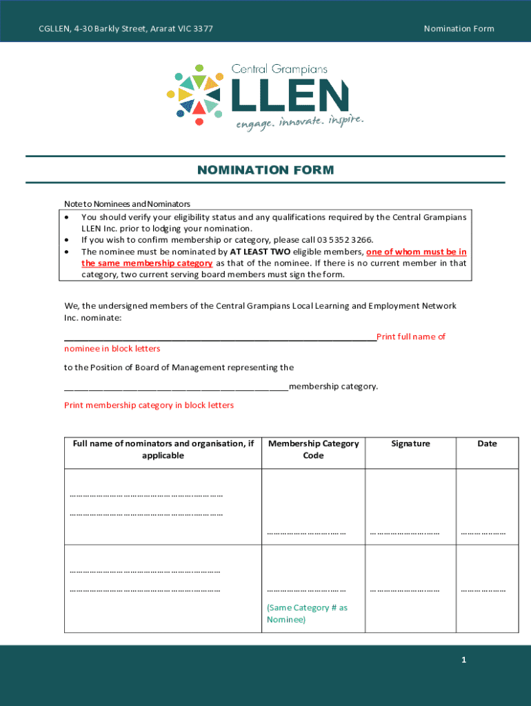 This form is used to nominate individuals for a position on the Board of Management of the Central Grampians Local Learning and Employment Network Inc. It includes sections for nominees and nominators to provide necessary information, confirm eligibility, and address potential conflicts of interest.