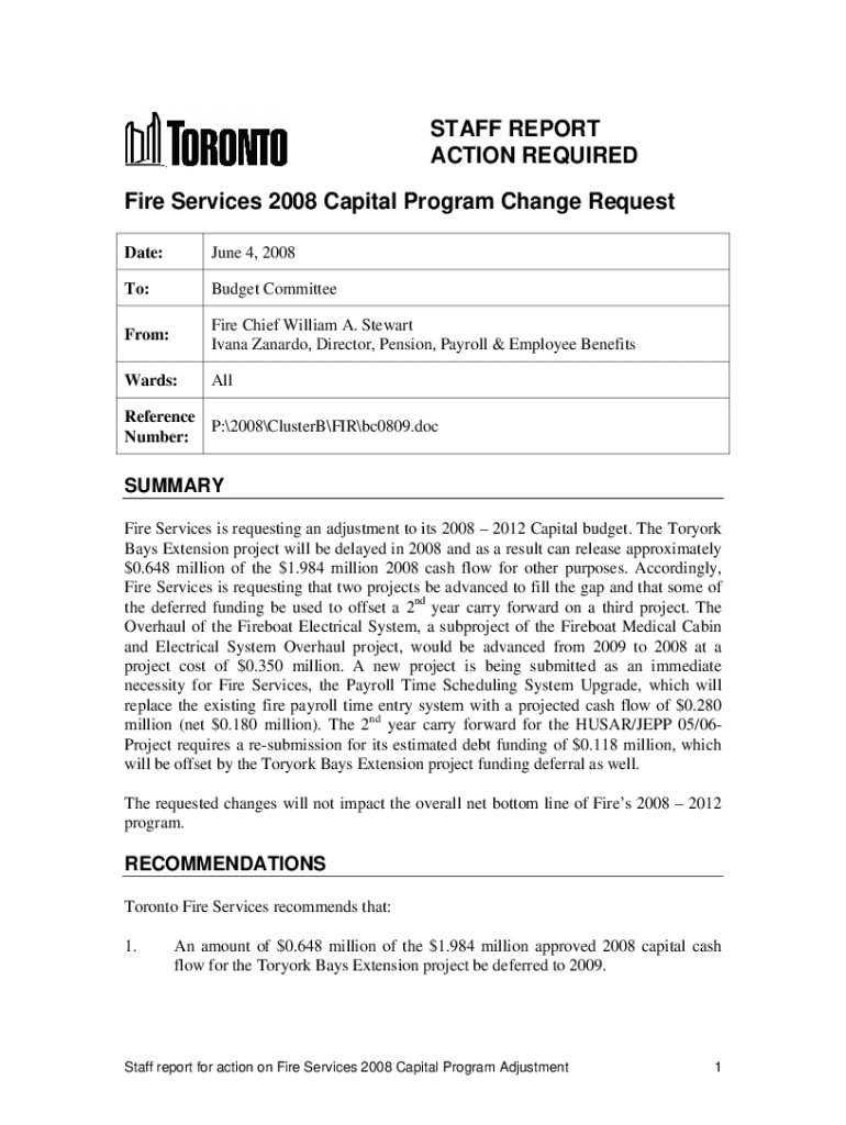 This staff report outlines a request by Fire Services for an adjustment to the 2008-2012 Capital budget due to the delay of the Toryork Bays Extension project. It includes detailed financial implications and proposals for reallocating funds to advance other necessary projects such as the Overhaul of the Fireboat Electrical System and the Payroll Time Scheduling System Upgrade, while ensuring no net change in the overall funding structure.