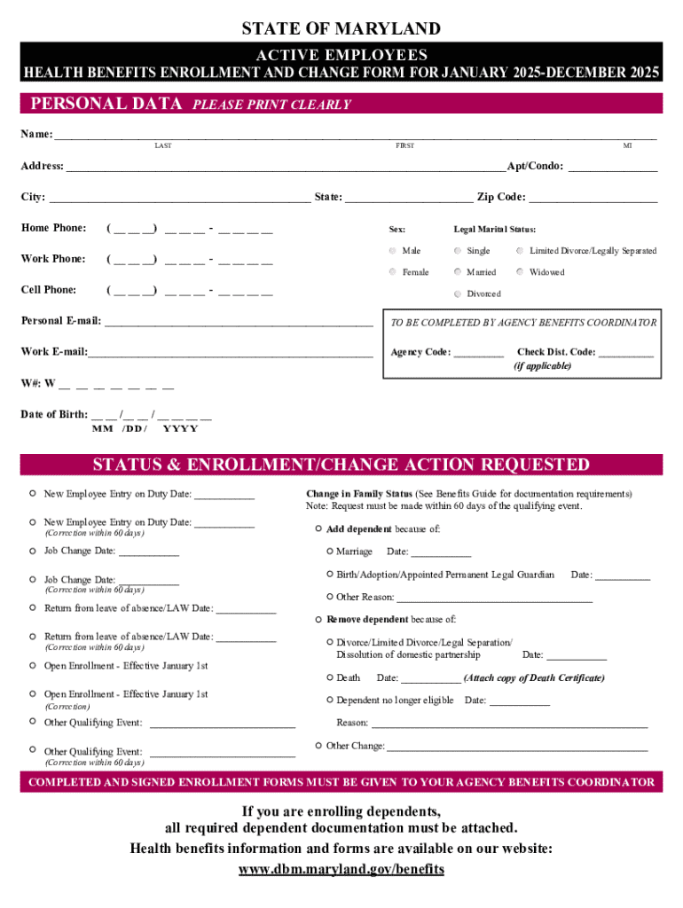 STATE OF MARYLAND ACTIVE EMPLOYEES HEALTH BENEFITS ENROLLMENT AND CHANGE FORM FOR JANUARY 2025DECEMBER 2025PERSONAL DATAPLEASE PRINT CLEARLYName:___ LASTFIRSTMIAddress:___Apt/Condo:___ City:___ State:___