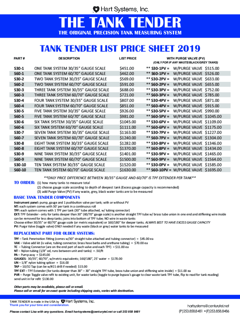 This document outlines the pricing and components of the Tank Tender precision measuring system for various tank sizes, including options for purge valves and replacement parts. It includes instructions for ordering and a section for billing and shipping information.