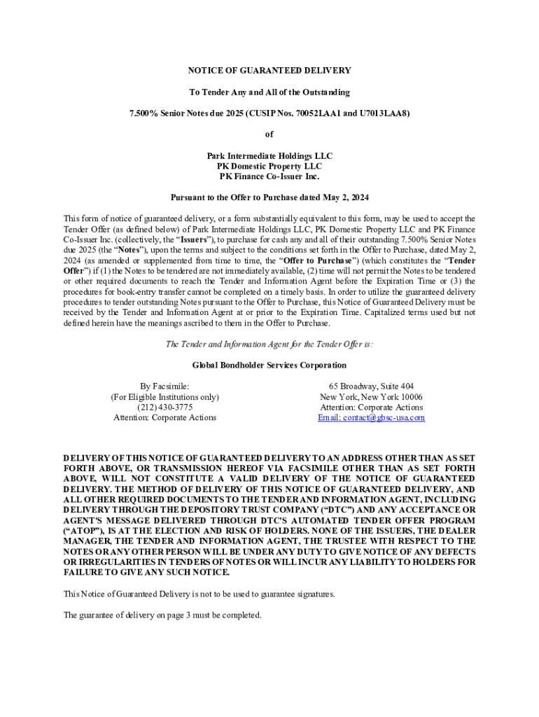This document serves as a Notice of Guaranteed Delivery for holders to tender their 7.500% Senior Notes due 2025 issued by Park Intermediate Holdings LLC, PK Domestic Property LLC, and PK Finance Co-Issuer Inc. The notice details the procedures required for acceptance of the Tender Offer set forth in the associated Offer to Purchase dated May 2, 2024.