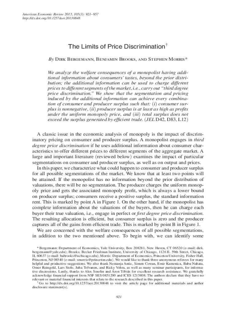American Economic Review 2015, 105(3): 921957 http://dx.doi.org/10.1257/aer.20130848The Limits of Price Discrimination By Dirk Bergemann, Benjamin Brooks, and Stephen Morris * We analyze the welfare